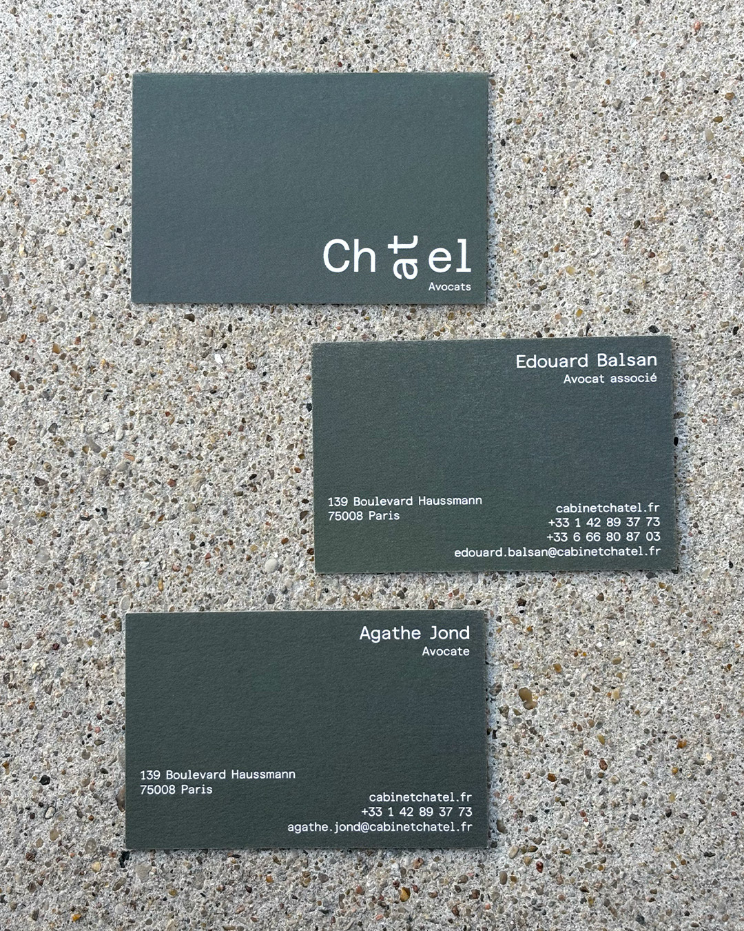 Le cabinet parisien Chatel Avocats m’a confié la refonte de son identité visuelle dans une volonté de modernisation. Pour le logotype, j’ai fait pivoter les caractères « AT » de 90° pour former subtilement le socle d’une balance.