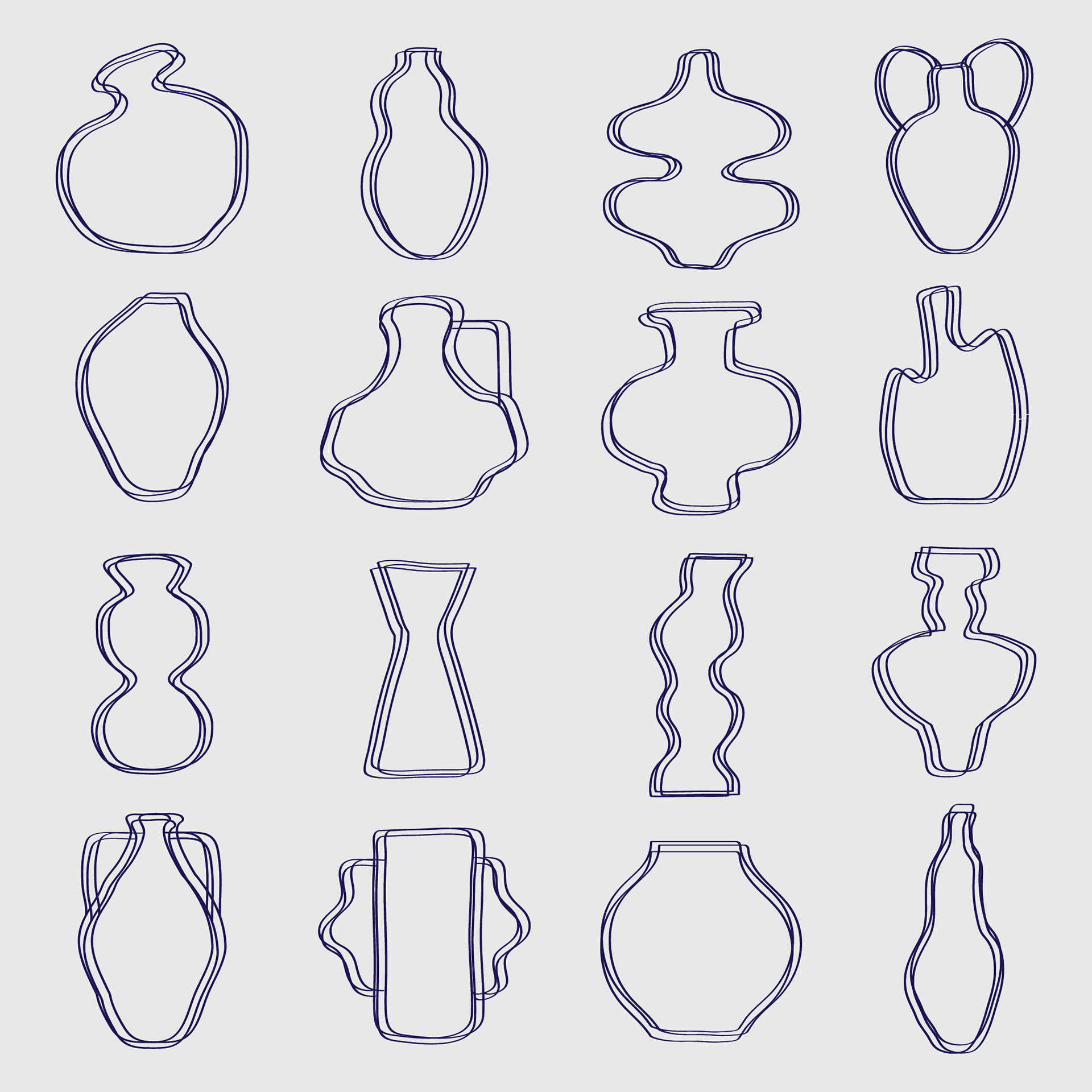 Différentes formes de vases ont été dessinées pour composer une identité vivante, chaque forme étant ensuite dupliquée en trois couches pour évoquer la superposition des matériaux qui caractérise son travail.